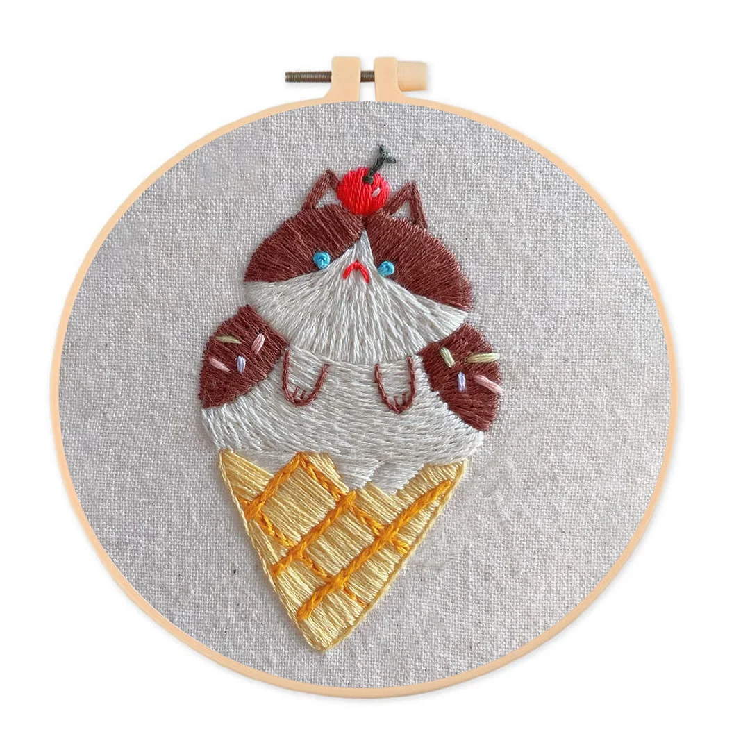 Embroidery Kit- Cat Ice Cream| Diy Kit For Starter Hand Stitch